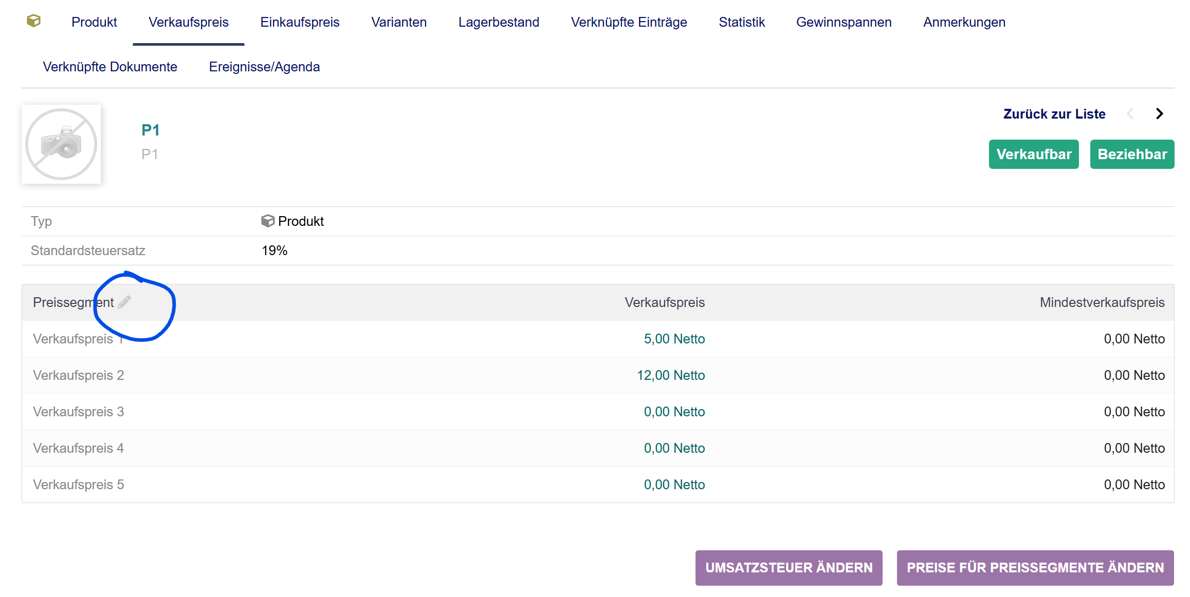 falls es sich um Preissegmente handelt: deren Bezeichnungen lassen sich bei den Produkten auf dem Tab für Verkaufspreise anpassen, dazu auf den markierten Stift klicken: