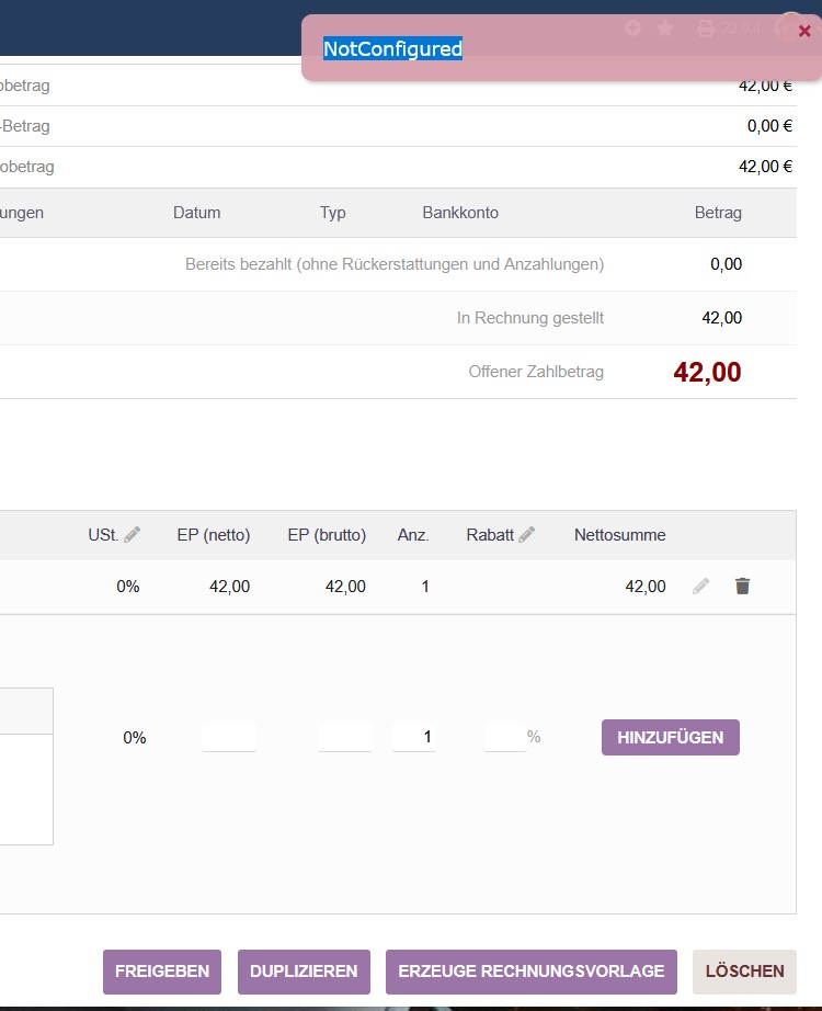 Kurz zu Plows Frage, Der Fehler tritt mit oder ohne aktives Buchhaltungsmodul gleichermassen auf.Sobald ich auf Freigeben gehe und dann “Betrag verbuchen” möchte kommt der Fehler.