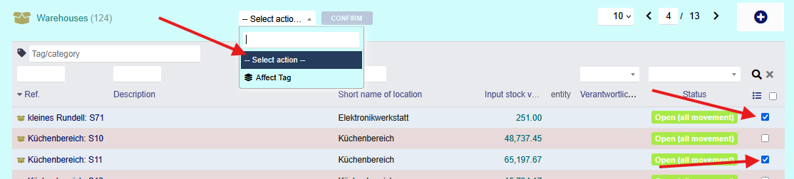 Als Beispiel: Auswahlfeld und „massactions“ bei Warehouses: